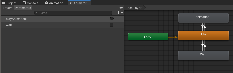 続いて、Animationを用意し、Animatorを作ります。Parametersから再生用のTriggerと待機させるようのBoolのパラメータを追加、