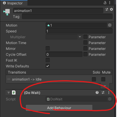 using System.Collections; using System.Collections.Generic; using UnityEngine; public class DoWait : StateMachineBehaviour { Animator anotherAnimator; override public void OnStateEnter(Animator animator, AnimatorStateInfo stateInfo, int layerIndex) { //アニメーション始まった時 if (animator.name.Equals("Image1")) anotherAnimator = GameObject.Find("Image2").GetComponent(); else anotherAnimator = GameObject.Find("Image1").GetComponent (); anotherAnimator.SetBool("wait", true); } override public void OnStateExit(Animator animator, AnimatorStateInfo stateInfo, int layerIndex) { //アニメーション終わった時 anotherAnimator.SetBool("wait", false); } }